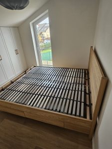 Montáž podlahových lišt nebo silikon místo prahu tam kde jsou přechody mezi místnostmi. Chybělo složit postel a nainstalovat garnýže. S kolegou jsme to vše vyřešili a rodina se mohla obratem nastěhovat. Také jsme připojili lednici na vodu a zapojili pár světel.