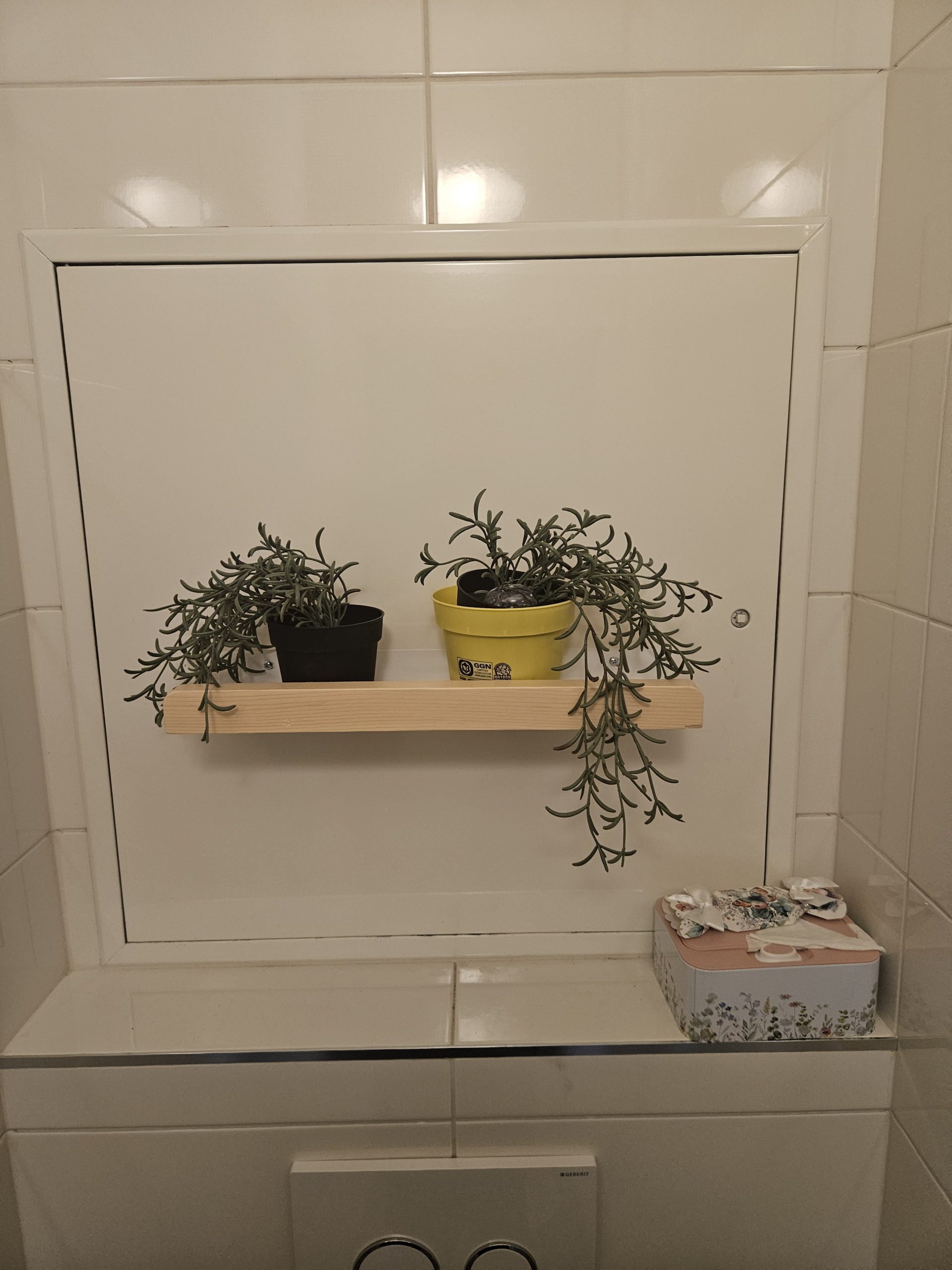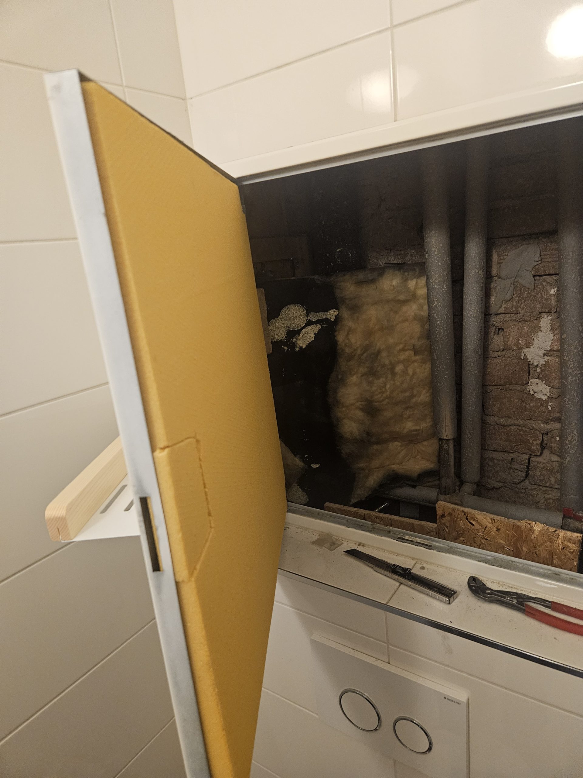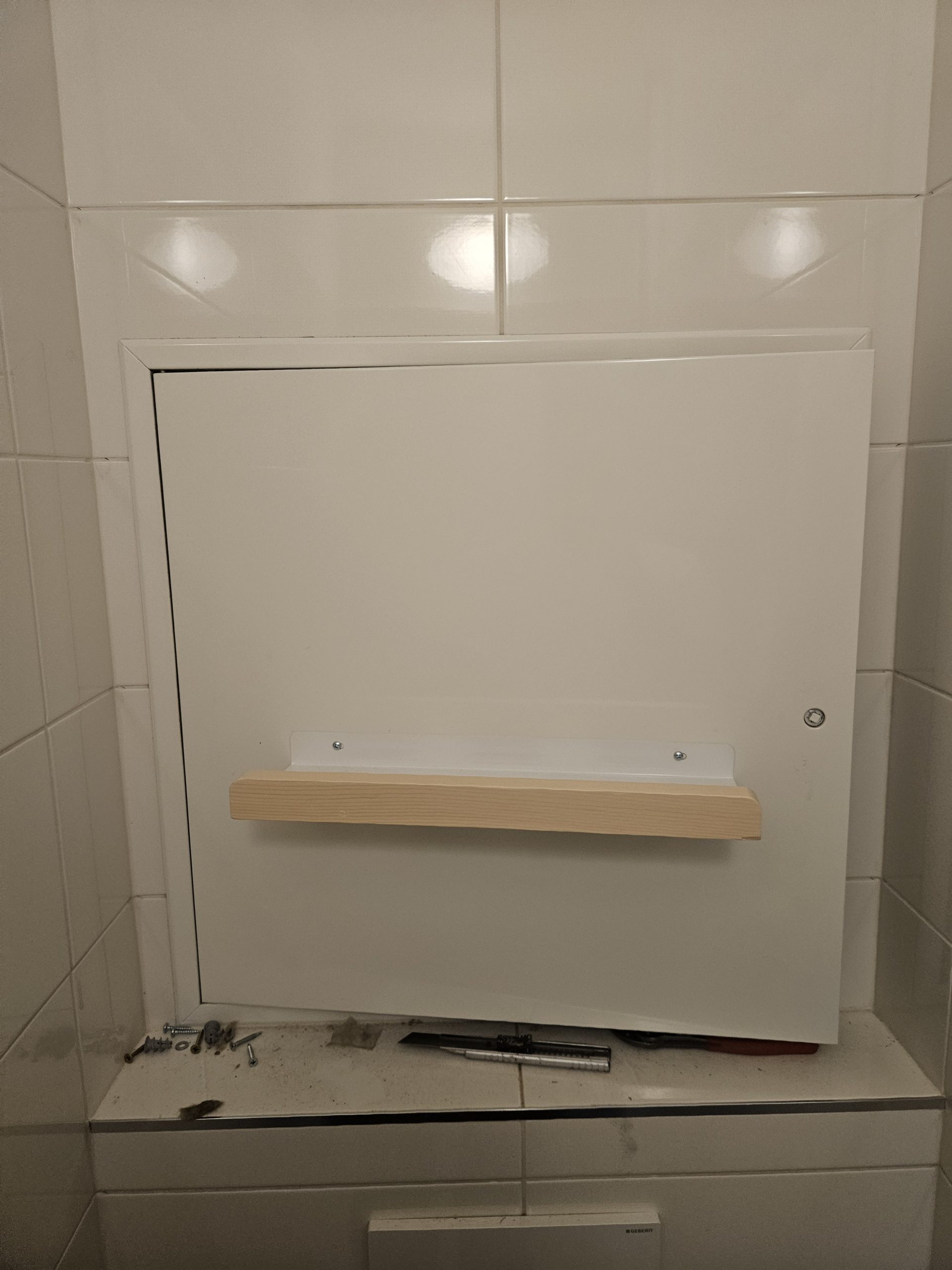 Instalace poličky na revizní dvířka která jsem zároveň zaizoloval polystyrenem proti hluku a zimě